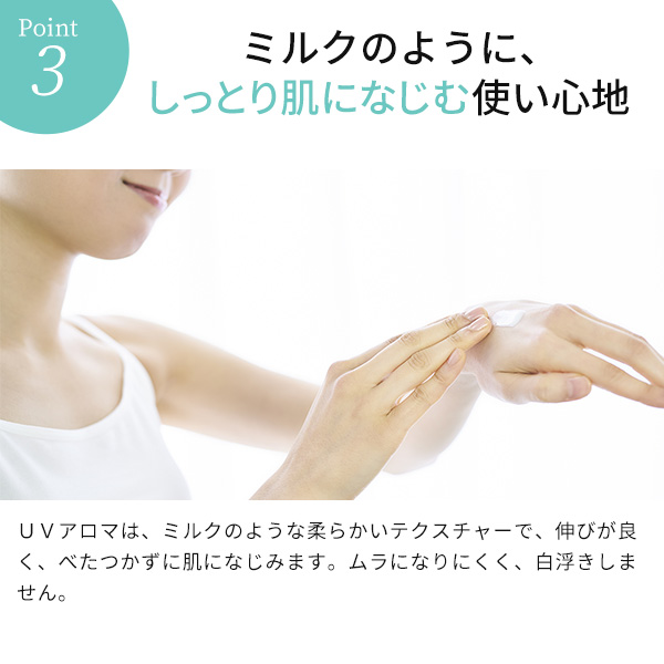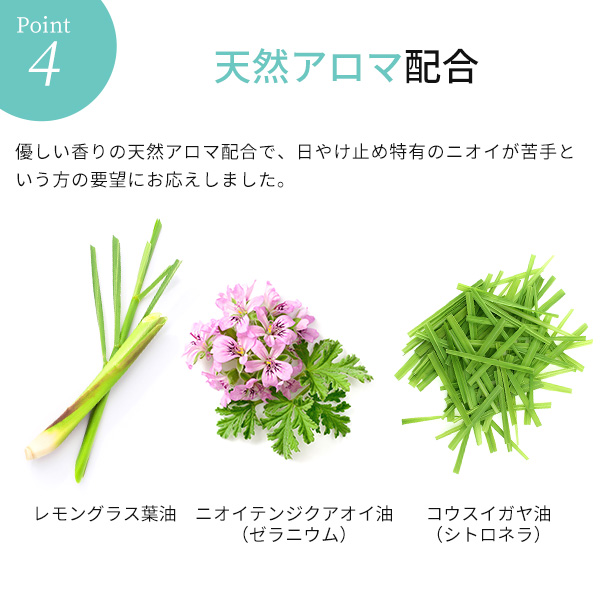 4.やさしい香りの天然アロマ配合で、日やけ止め特有のニオイが苦手な方にも使いやすい。