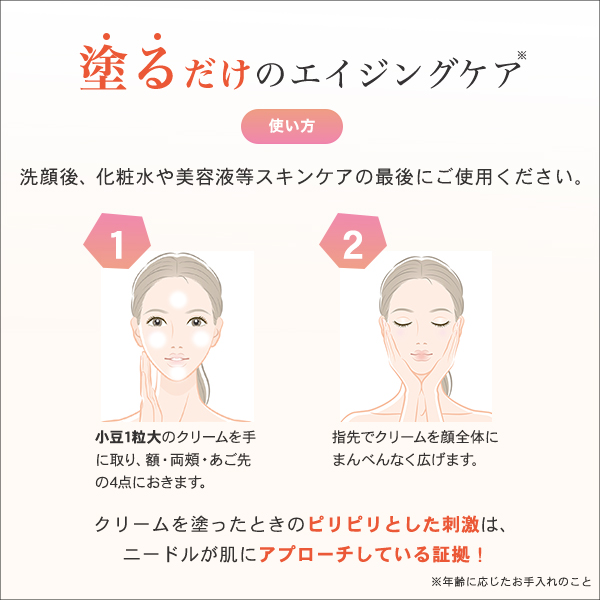 24種類の美容成分、次世代の成分「NMN(ニコチンアミドモノヌクレオチド)」とヒト幹細胞を配合、肌の土台を整えてうるおいとハリのある肌にサポートします。150~200マイクロの微細な針「スピキュール(マイクロニードル)」が肌に直接刺さることで、美容成分を肌内部※に浸透させます。 塗るだけ、自宅でエステ級のエイジングケア!