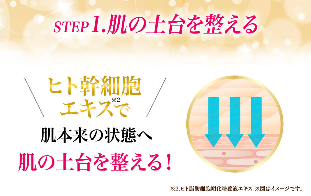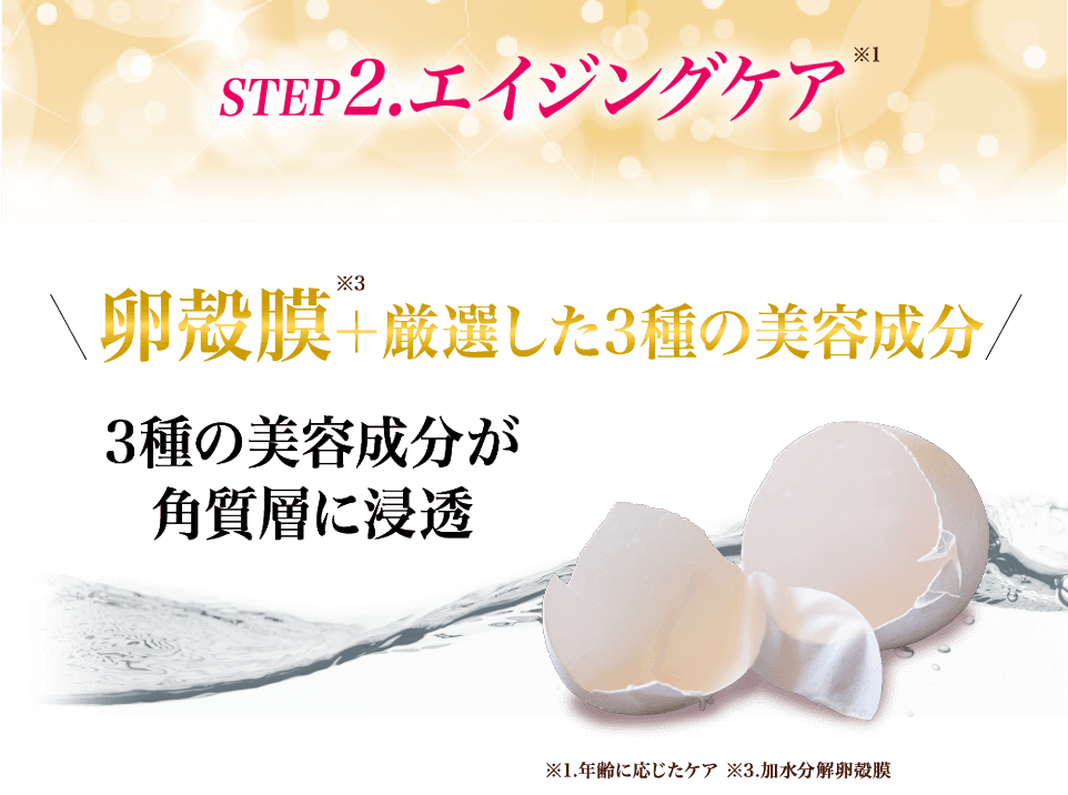 肌の奥からうるおいが湧き出す。浸透しにくくなった大人の肌にもしっかり行き渡り、実年齢を感じさせない肌へ導きます。 「卵殻膜」と「ヒト幹細胞」の2種類を贅沢に配合した美容原液です。肌を土台から整え、「ツヤ」「ハリ」「保湿」を与えます。