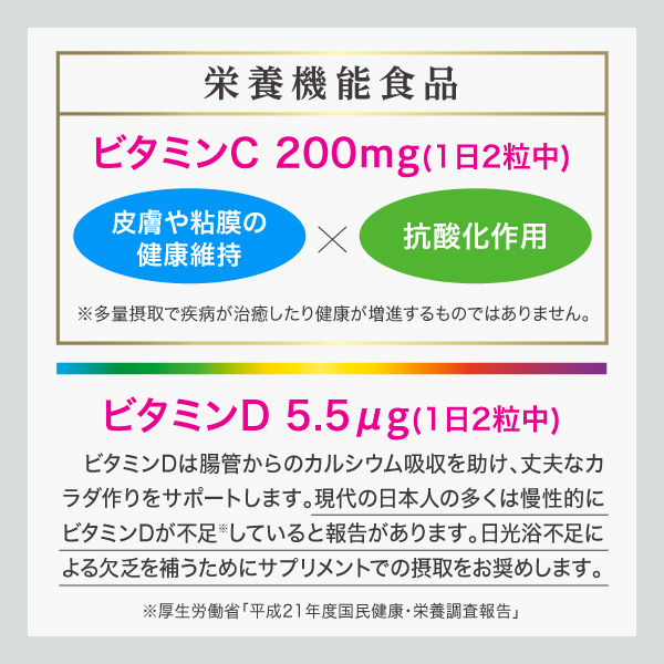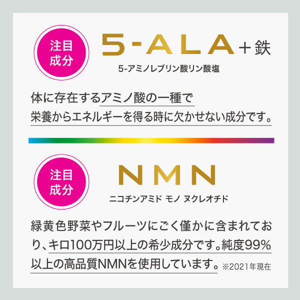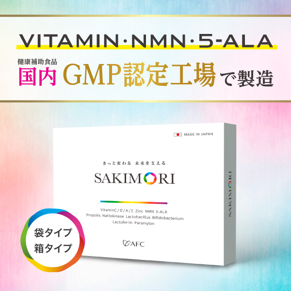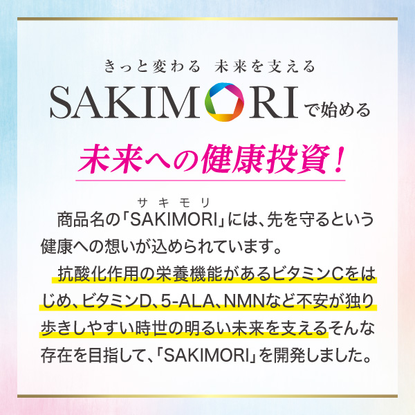 抗酸化作用の栄養素機能があるビタミンCをはじめ、ビタミンD、その他の健康サポートビタミン・亜鉛も配合。さらに、5-ALA、NMNなど話題の成分も配合。先を守るという健康への想いから「SAKIMORI」を開発しました。