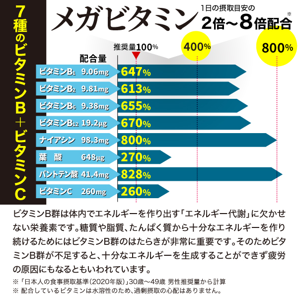 ビタミンB群は身体内でエネルギーを作り出す「エネルギー代謝」に欠かせない栄養素です。