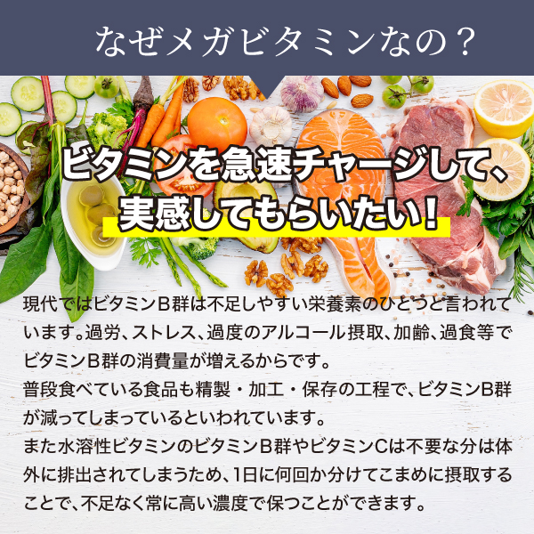 毎日頑張っている男性のために開発された【SHIN.メガビタミン&エナジーサプリメント】は、7種類のビタミンB群にビタミンCを加えて、全部8種類のメガビタミンで、体内に不足しやすいビタミンB群を常に高い濃度でキープします。