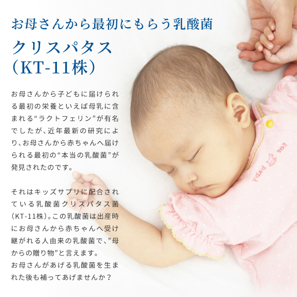 乳酸菌 クリスパタス(KT-11株)、DHA、カルシウム・ビタミンD、鉄、国産野菜パウダー等栄養素を配合したマルチサプリメントです。