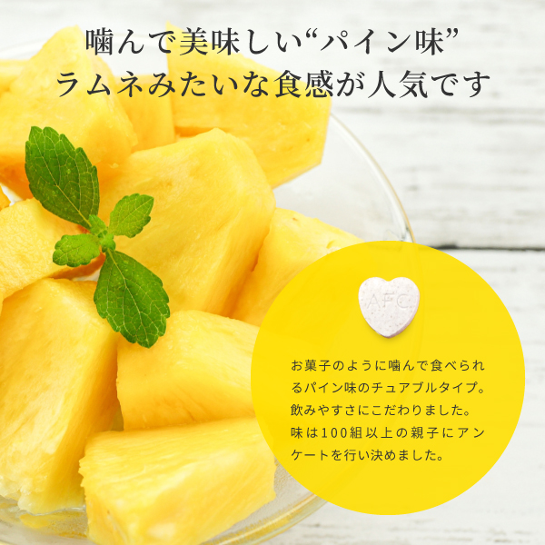 子どもの健やかな成長を願い、乳酸菌・DHA・カルシウム・野菜・鉄を配合したマルチ栄養サプリメント。ラムネのように噛んで食べられます。パイン味。