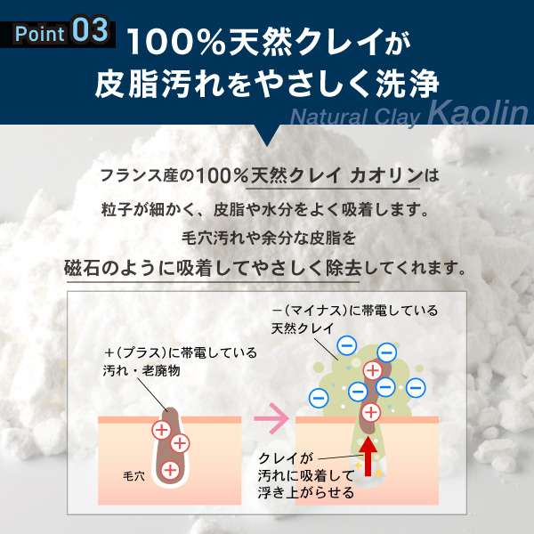 フランス産の天然クレイ「カオリン」を配合でにおいの原因となる毛穴汚れ、余分な皮脂をしっかり吸着除去。
