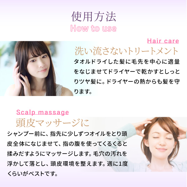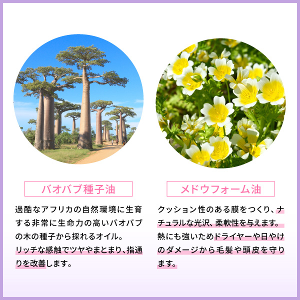 3種の植物オイルを配合し、まとまったツヤある美しい髪に整えます。