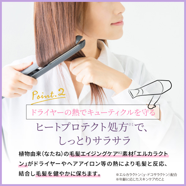 さらに、熱反応性毛髪補修成分「Y-ドコサラクトン」を配合し、ハリやコシを与える。ドライヤー、ヘアアイロンなどの熱によりのダメージを補修する。