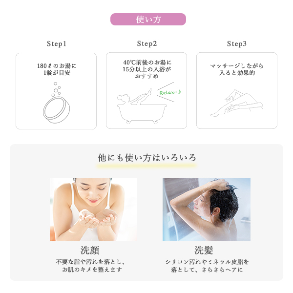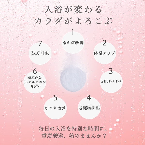 重炭酸温浴法は温浴効果を高めるから、血流を良くし、体の隅々までポカポカにします。冷え性、疲労回復、腰痛などを緩和。 さらに、保湿成分L-アルギニン配合でお肌もしっとり。洗髪にも使用でき、髪や頭皮もうるおいます。
