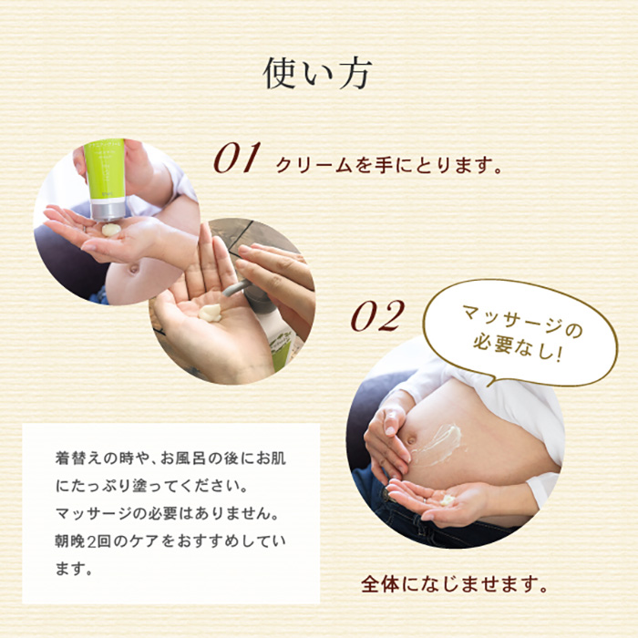 △マタニティクリームのパッケージと実際にお腹に塗っている写真