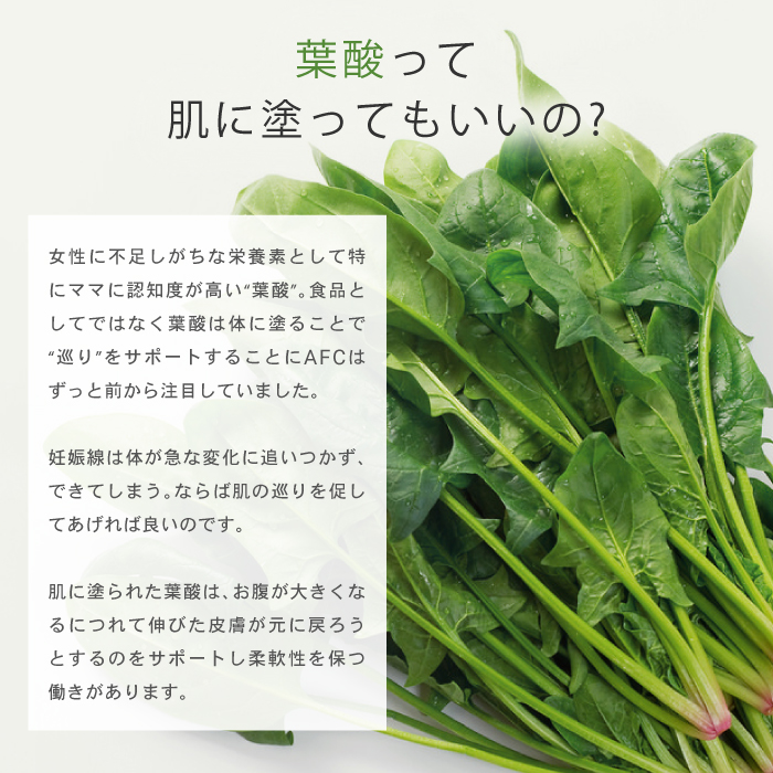 肌に塗られた葉酸は、お腹が大きくなるにつれて伸びた皮膚が元に戻ろうとするのをサポートし柔軟性を保つ働きがあります。