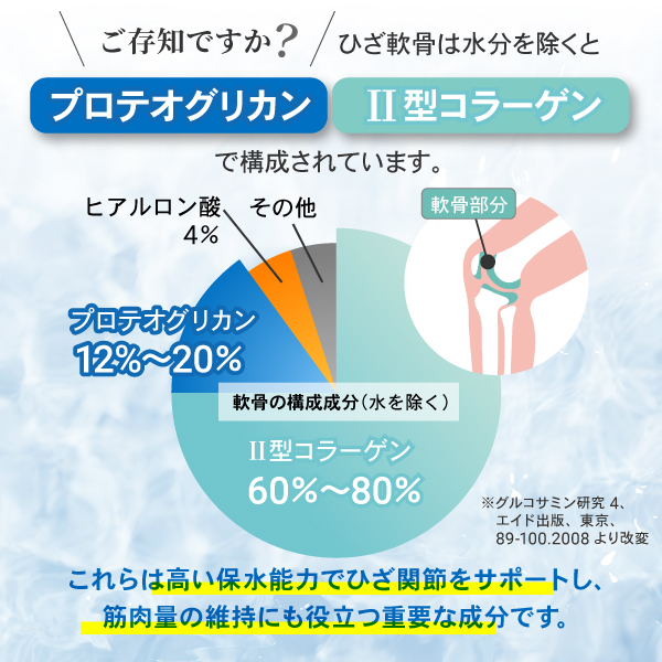 本品はサケ鼻軟骨由来プロテオグリカンと非変性Ⅱ型コラーゲン2つの機能性関与成分を配合しました。この2つの成分には、中高年健常者のひざ関節の曲げ伸ばしを伴う動きをサポートする機能があることが報告されています。
