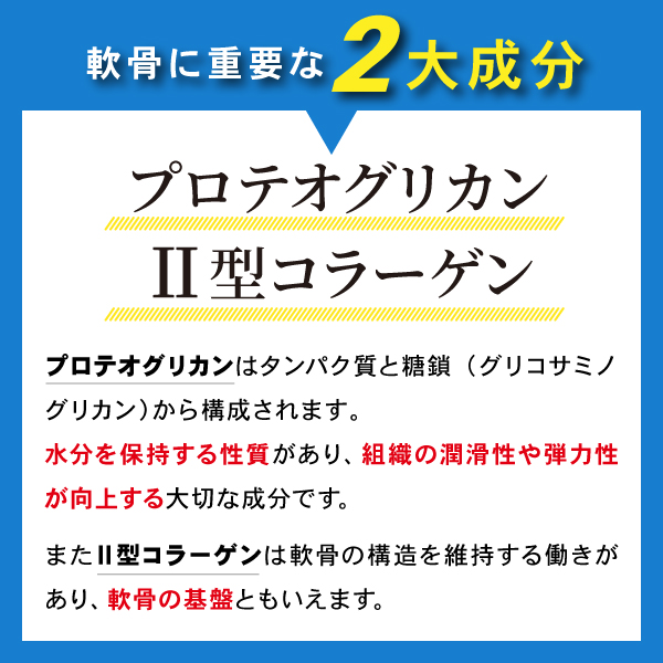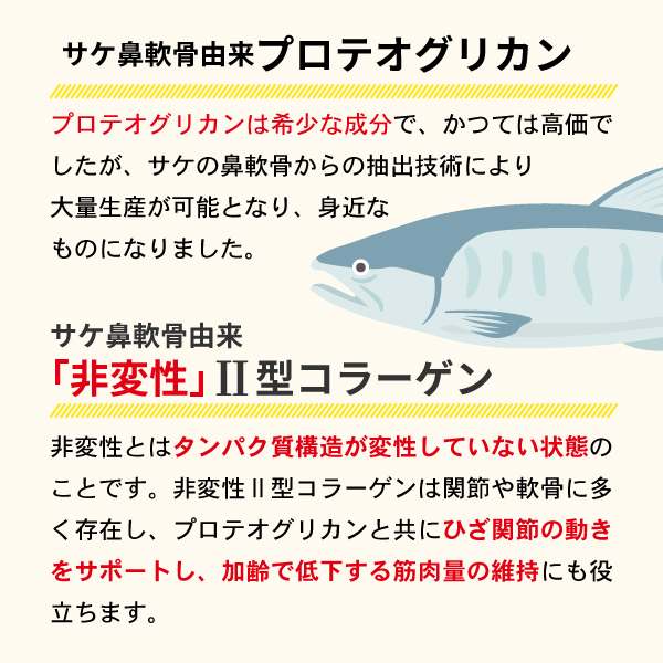 サケ鼻軟骨由来プロテオグリカンと非変性Ⅱ型コラーゲン2つの機能性関与成分を配合。