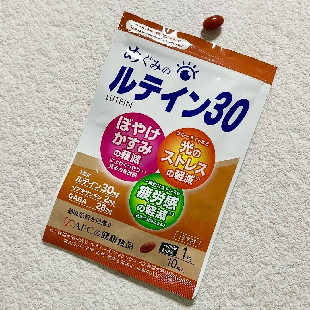 【機能性表示食品】 めぐみのルテイン30(10日分) \" 見ること "を内側からケア/ 目にやさしい成分として知られるルテインは、 本来体内では生成できないため、食事やサプリで意識して摂ることが大切とされています💡 \配合成分/ ✔️ルテインを1粒に30mg※1(マリーゴールド由来) ✔️ゼアキサンチン2mg配合※1 ✔️疲労感の軽減※2にGABA28mg配合 ※2 一時的なストレスや疲労感の軽減(仕事や勉強による) 一日1粒目安で、カプセルタイプでつるんと飲み込みやすいです✨ 夕方の文字が見やすく感じ、目のかすみがやわらいできたような気がします👀(※個人の感想です) 「見る力」を整えるケアは、自分らしく毎日を楽しむための大切なサポート🫶🏻 10日間のトライアルを是非チェックしてみてくださいね🥰 ※1:機能性関与成分として 【届出番号:F748】 【届出表示】本品にはルテイン、ゼアキサンチンとGABA が含まれます。ルテイン、ゼアキサンチンには、目の黄斑部の色素密度の増加によるブルーライトなどの光のストレスの軽減、コントラスト感度(ぼやけ・かすみの軽減によりくっきり見る力)を改善し、目の調子を整えることが報告されています。 GABA には、仕事や勉強による一時的な精神的ストレスや疲労感を軽減する機能があることが報告されています。 本品は、事業者の責任において特定の保健の目的が期待できる旨を表示するものとして、消費者庁長官に届出されたものです。ただし、特定保健用食品と異なり、消費者庁長官による個別審査を受けたものではありません。 【機能性関与成分】ルテイン30mg、ゼアキサンチン2mg、GABA28mg(1粒あたり) @afc_online #PR #エーエフシー #AFC #エーエフシー #株式会社エーエフシー #supplement #サプリメント #サプリ #めぐみのルテイン30 #ルテイン #lutein #GABA #ギャバ #ゼアキサンチン #目の健康 #機能性表示食品 #アイケア #ブルーライト #ストレス #目のケア #monipla #afc_fan