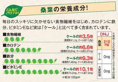 一般的な青汁に使用されるケールや大麦若葉にはなく、桑葉特有の成分であるDNJ。DNJには、甘いもの(糖分)が好きだけど摂り過ぎが気になるという方にとって強い味方です!