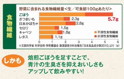 他の野菜に比べてこの3つの成分がバランスよく含まれており、焙煎することでさらにポリフェノール量がアップします。(特許番号5661263号)この焙煎ごぼうを配合することにより、香りがよく飲みやすい味に仕上げました。