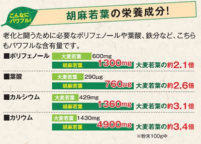 胡麻若葉には、青汁の定番である大麦若葉を上回るポリフェノールや葉酸が含まれており、エイジングケアをサポートしてくれます。