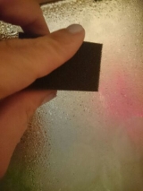 なかなか落ちにくかった浴室のガラスに付着した白い鱗状(汚れ)を業務用の研磨パット(人工ダイヤモンド配合)付きスポンジできれいに落とします。パッドは柔軟なスポンジに張り合わせているので、ガラスや鏡の他に、トイレや洗面台、タイル、蛇口の隙間まで使用することもできます。