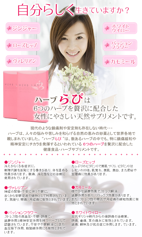 女性特有の悩み、生理痛。そのために貴女らしさが失われてしまわないよう、もっと輝く貴女でいられるよう、6つのハーブを贅沢に配合したハーブらぴがきれい生活を応援していくコミュニティサイトです。