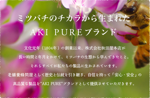 はちみつやローヤルゼリー、プロポリスなど、ミツバチの恵みを扱うアキピュアのファンサイトです。ミツバチからの自然の恵みをお役に立てていただければ幸いです。お気軽にご参加ください。
