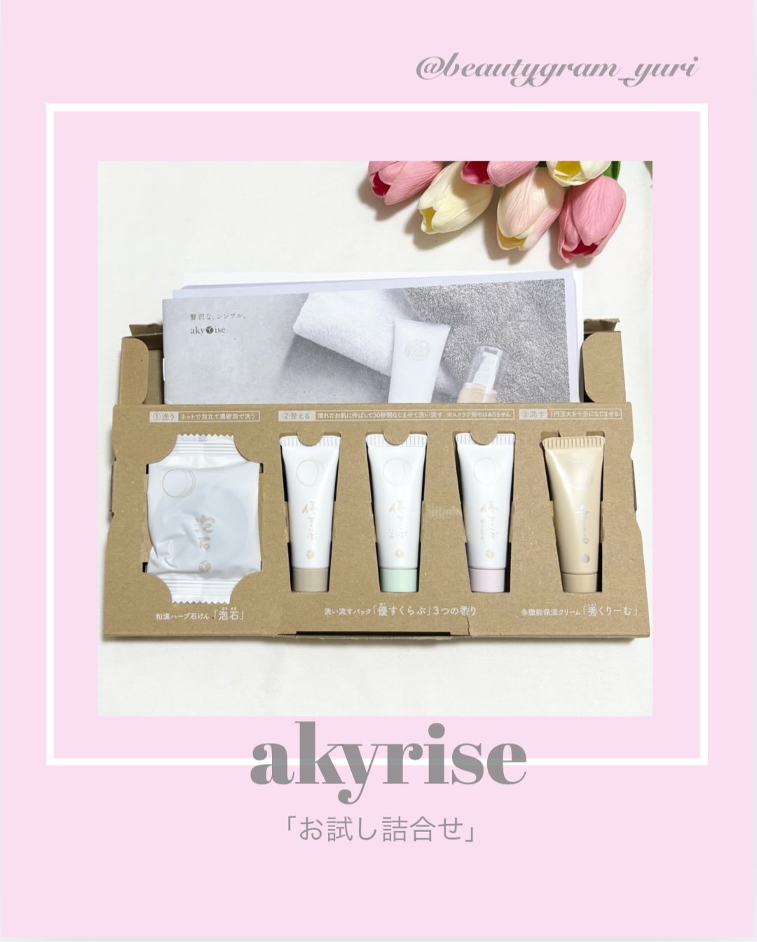 「つけスギ」「塗りスギ」「洗いスギ」の『やりスギケア』からすはだを解放し、すこやかな肌を目指す、akyriseのスキンケアのお試し詰合せです。 泡石...深緑の和漢ハーブ石けん。弾力のある生クリームのようなキメ細かい濃密泡が、毛穴の汚れや皮脂、不要な角質をすっきりと落としながら、潤いを残して洗い上げます。濃密泡の秘密は、潤い成分10種の和漢ハーブ濃縮エキス「草根木皮たまり」をぎゅっと固めたから。洗い上がりはすっきり&もちもち! 優すくらぶ...毎日使ってお肌を整える潤いパック。荒れて固くなった土をほぐすように、お肌をやわらかくしてキメを整えます。「泡石」濃密泡洗顔の後、濡れたお肌にのばして30秒で洗い流すだけ。お肌の様子に合わせて毎日1〜2回お使いいただくと、しっとりやわらかく、みずみずしいお肌に導きます。 秀くりーむ...洗顔後の保湿は朝晩これ1本で完了。「草根木皮たまり」とお肌に不可欠なセラミド、コラーゲンなどが保湿をしっかりサポート。ジェルのようなテクスチャーでベタつかず、さらっとしているのにしっとり潤います。乾燥や気になる部分には重ねづけして潤いチャージに。