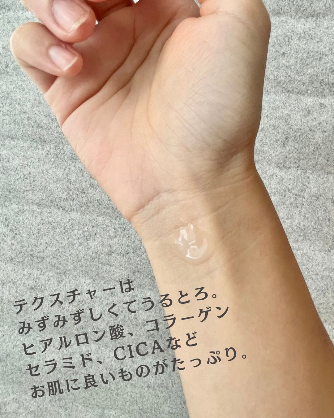 ヒアルロン酸、コラーゲン、セラミド、アロエ、CICAなどが配合。お肌に良いものがたっぷり。