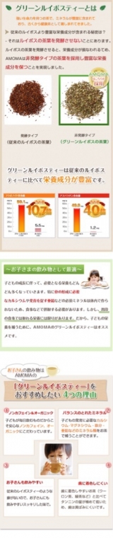 一般的なルイボスティーは発酵させたルイボス茶葉を使いますが、AMOMAでは栄養分が豊富な非発酵タイプのグリーンルイボスを使用。非発酵のグリーンルイボスは発酵された通常のルイボスに比べてそのフラボノイド量が10倍!紅茶のような風味で通常のルイボスティーはクセがあってちょっと苦手という方にもオススメです。