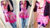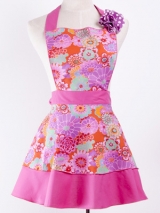 ビビッドなピンクの生地にカラフルなお花のプリントが とってもキュート☆胸当て付きエプロンです♪