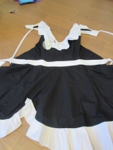 大きめのフリルがとても大胆で華やかな ダイアゴナル クッキー&クリーム エプロンです。 シックなブラックにホワイトのフリルが華やかさをプラス☆ とても素敵なデザインです!
