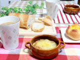 | ◆◇パン&ホットスープ◇◆ 新商品の2種類のホットスープと合わせてお召し上がりいただきたいパンをアソートしました。手軽に絶品オニオングラタンスープをお楽しみいただけます。 |