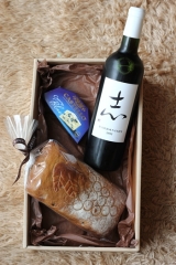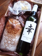 アンデルセンファームワイン「志」、「幸」どちらかお好みのワインと、収穫のフルーツブレッド、チーズのアソートをお届けします。
