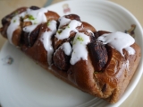 | 大人のためのこだわりのチョコレートブレッドマイスタースイーツブレッド チョコ&ベリー生地にはマジパンペーストとヴァローナチョコレート(カラク)、ローストしたくるみ、洋酒につけたクランベリーを加え、ちょっとビターなガナッシュを巻き込んでいます。ガナッシュにはヴァローナ(グアナラ)とフランボワーズを使用。しっとりとした生地にチョコの甘みとベリーの酸味がぴったりです。 | |