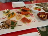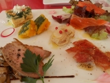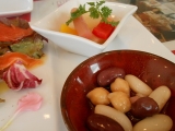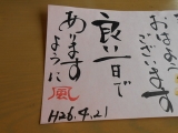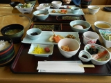 二日目の朝、小雨が降っています が、朝食で気を取り直しましょう 今朝も手書きのメッセージカードで元気をもらいます 大鉢いっぱいの野菜サラダが嬉しいです 小鉢もずらりと並び 温泉卵、ふぐの一夜干し、切り干し大根の煮物、しじみの和え物、佃煮etc 朝から甘エビのお刺身… 2014/04/24