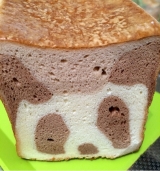 | パンダ食パン(1本)牛乳と練乳で仕込んだほんのり甘いミルク生地をベースに、ココア生地の濃い色と薄い色でパンダの顔になるよう、11個に分けた生地を順々に伸ばし重ねて、ケースに入れて焼き上げています。カットする場所によって、パンダの表情が微妙に変わるのもお楽しみ。ふんわりした食感で食べやすく、食卓で会話の弾むかわいらしさです。 | |