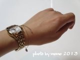 | アジャスターの先には、ボタンカットの アメジストをさりげなくワンポイントで入れて みました。同じアメジストでもカットによって、 色合いの違いが楽しめます。 |