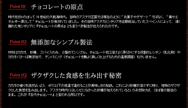 時は、16世紀の大航海時代。当時のアステカ王国で食されていたチョコレートこそ、チョコレートの原点とも言うべきもの。