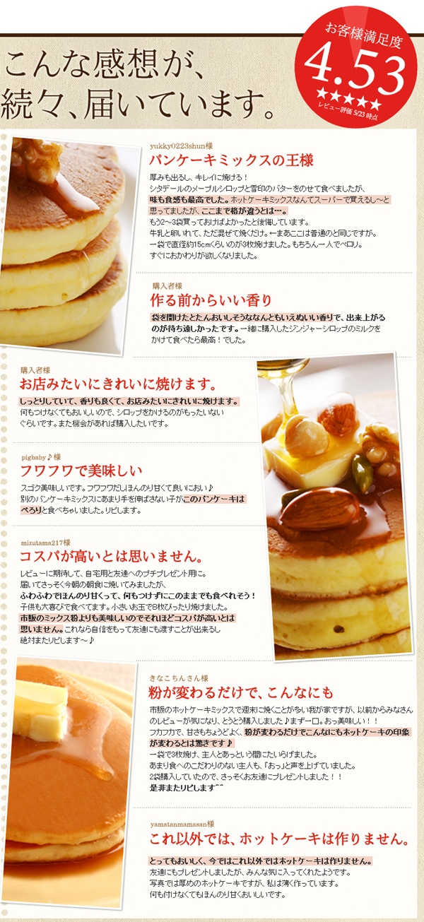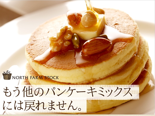 お客様レビューでも大好評、こだわりの北海道産の食材を使った、ふんわり、しっとりパンケーキミックス。