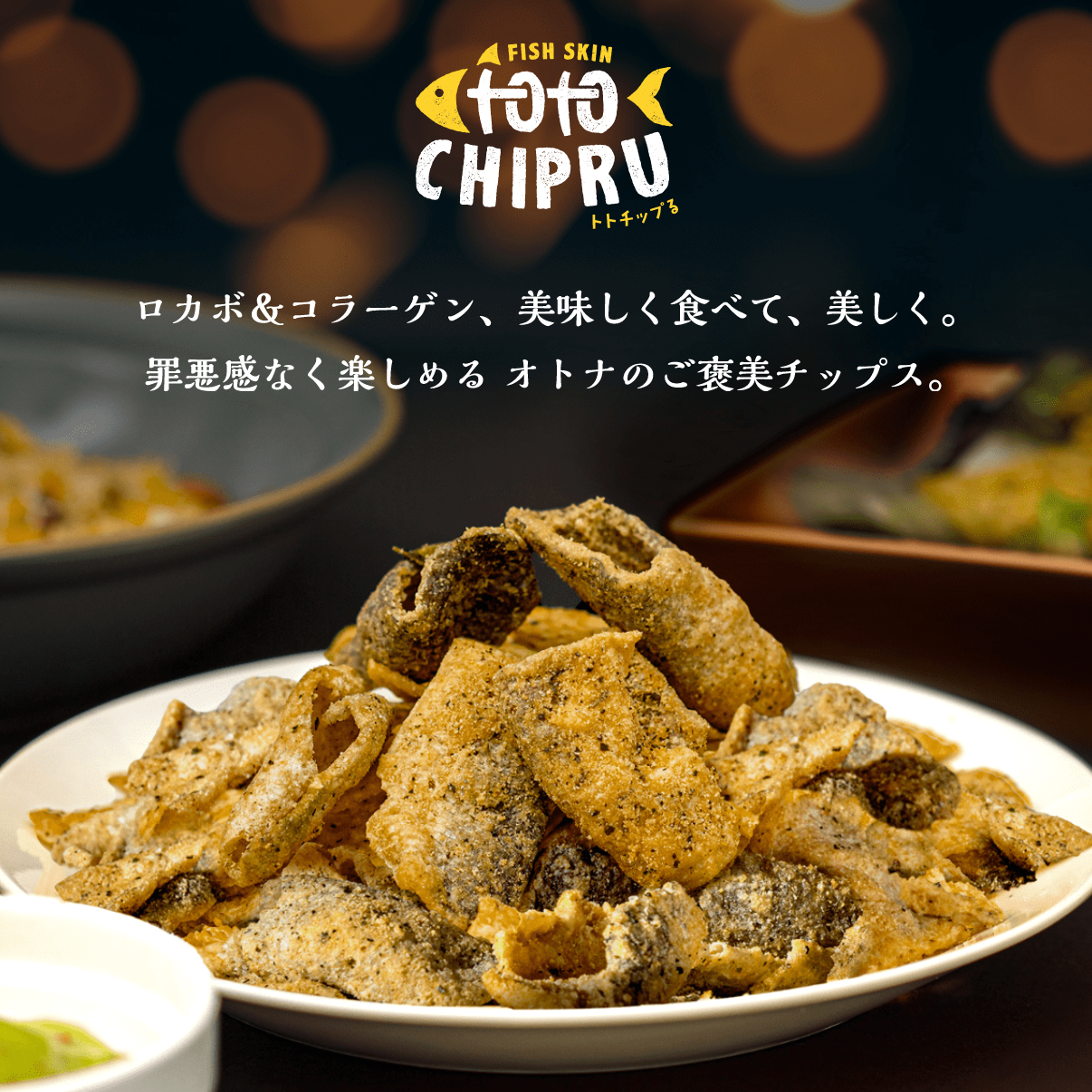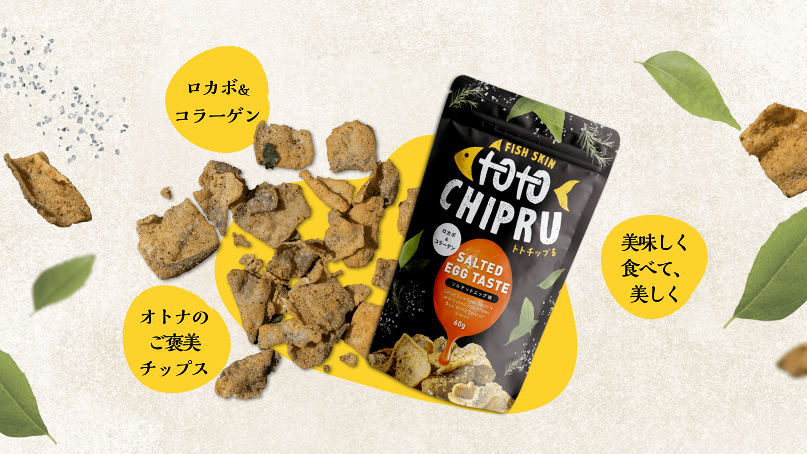 ロカボ&コラーゲン、美味しく食べて美しく。罪悪感なく楽しめる オトナのご褒美チップス【トトチップる】 世界のフードロスを救う!白身魚の皮で作ったフィッシュスキンチップスです。こだわりのカリっと食感、濃厚なソルテッドエッグ味がやみつきに!