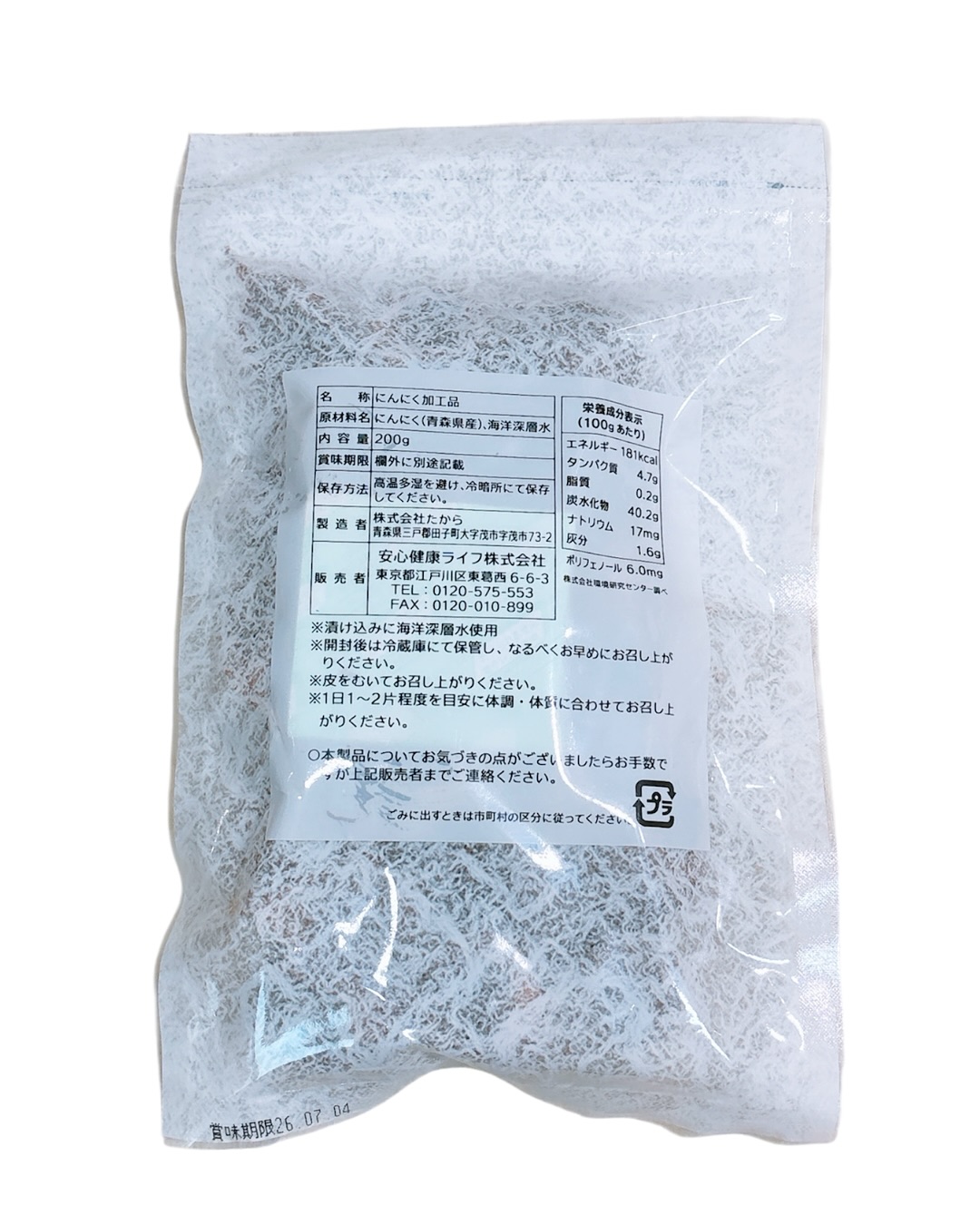 また、熟成させることにより、ポリフェノール類の含有量がおよそ8倍に増え、 生にんにくには存在しない「健康の源」S-アリスシステインという水溶性含硫アミノ酸が生成されている。
