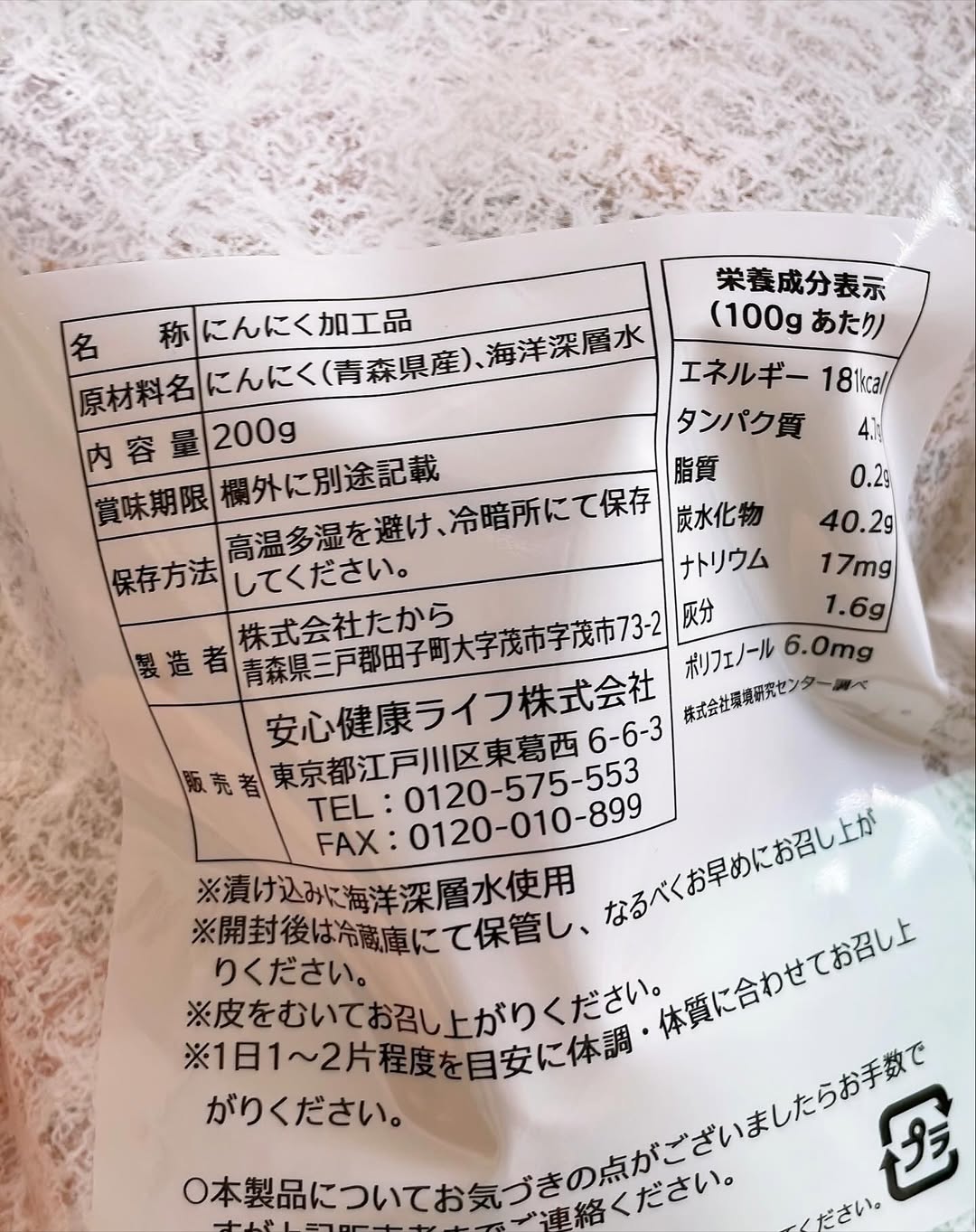 半年以上かけて端正に栽培されたにんにくをミネラルが豊富な海洋深層水で漬け込んでいて、更に添加物フリー