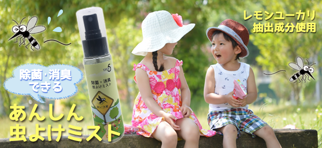「ファイブヘルツ 除菌・消臭 虫よけミスト」は、レモンユーカリから抽出された天然由来の安全な成分で、蚊をシャットアウト。
