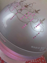 | シャンデリアデザイン上部にあるキャンドルには、スワロフスキー社のクリスタルをあしらい、上品な光を演出します。 | ON/OFFボタンを押すとLEDが点灯し、ガラスボウルの中で揺れる水を照らします。約3時間で自動停止します。途中で消灯する際は、もう一度ON/OFFボタンを押し、電源を切ってください。(単三電池×3本必要/電池は付属されていません) | 従来のマジックボールとは違い、ヘッド部分の蓋が取り外し可能になり、ヘッドカバーの内側までお手入れが出来るようになりました。 |