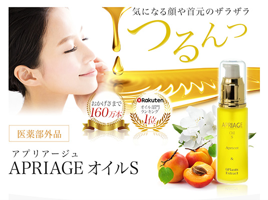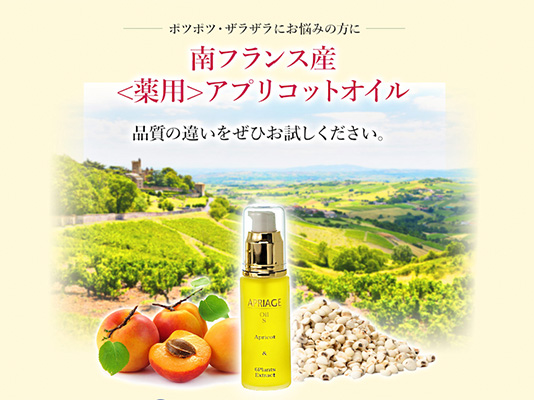 加齢や紫外線で失われゆく皮脂。失われゆくものは、補う事が大切。 南フランス産杏仁オイル(アプリコットオイル)と有効な植物成分を配合したアプリアージュオイルSは、乾燥した肌に潤いを与える理想的な美容オイルです。