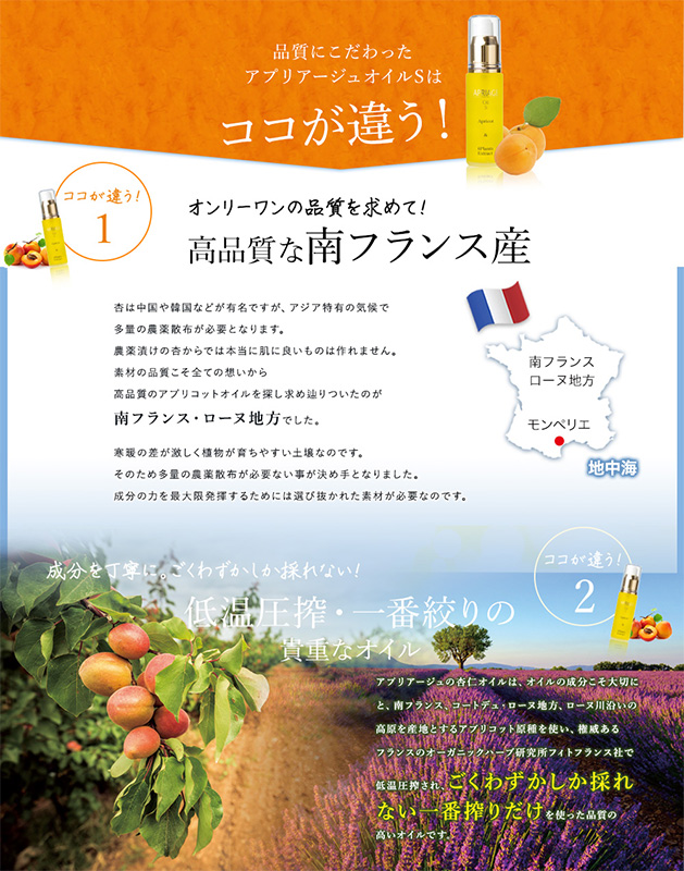 AiBでは、“究極の美肌ケア”そして“究極の基礎化粧品作り”のため、主成分のアプリコットオイルの産地を南フランス・ローヌ地方に限定しています。