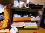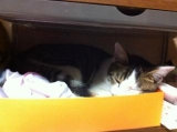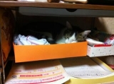 わかりますか? とっちらかっていますが ここですよ 眠っています 小物入れの中にもぐりこんで眠っています ここなんですねぇ〜かわいいじゃないですかぁ 2011/10/20