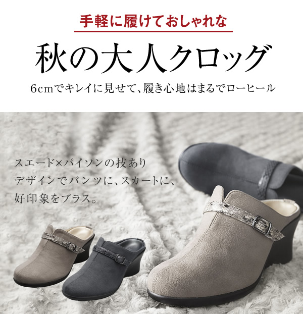 ローヒールの履き心地で歩きやすい6cmヒールクロッグ。
