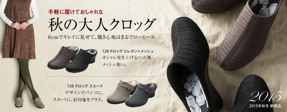 【秋冬新作アイテム】秋の行楽シーズンに♪気軽に履けておしゃれなクロッグ♪アーチフィッター128クロッグスエードローヒールの履き心地で歩きやすい6cmヒールクロッグ立ちっぱなしでも疲れ知らず★足裏に負担をかけな い安定機能 アーチをサポートして足トラブルを防止します ヒールでもグラつきにくい安定… 2015/11/12
