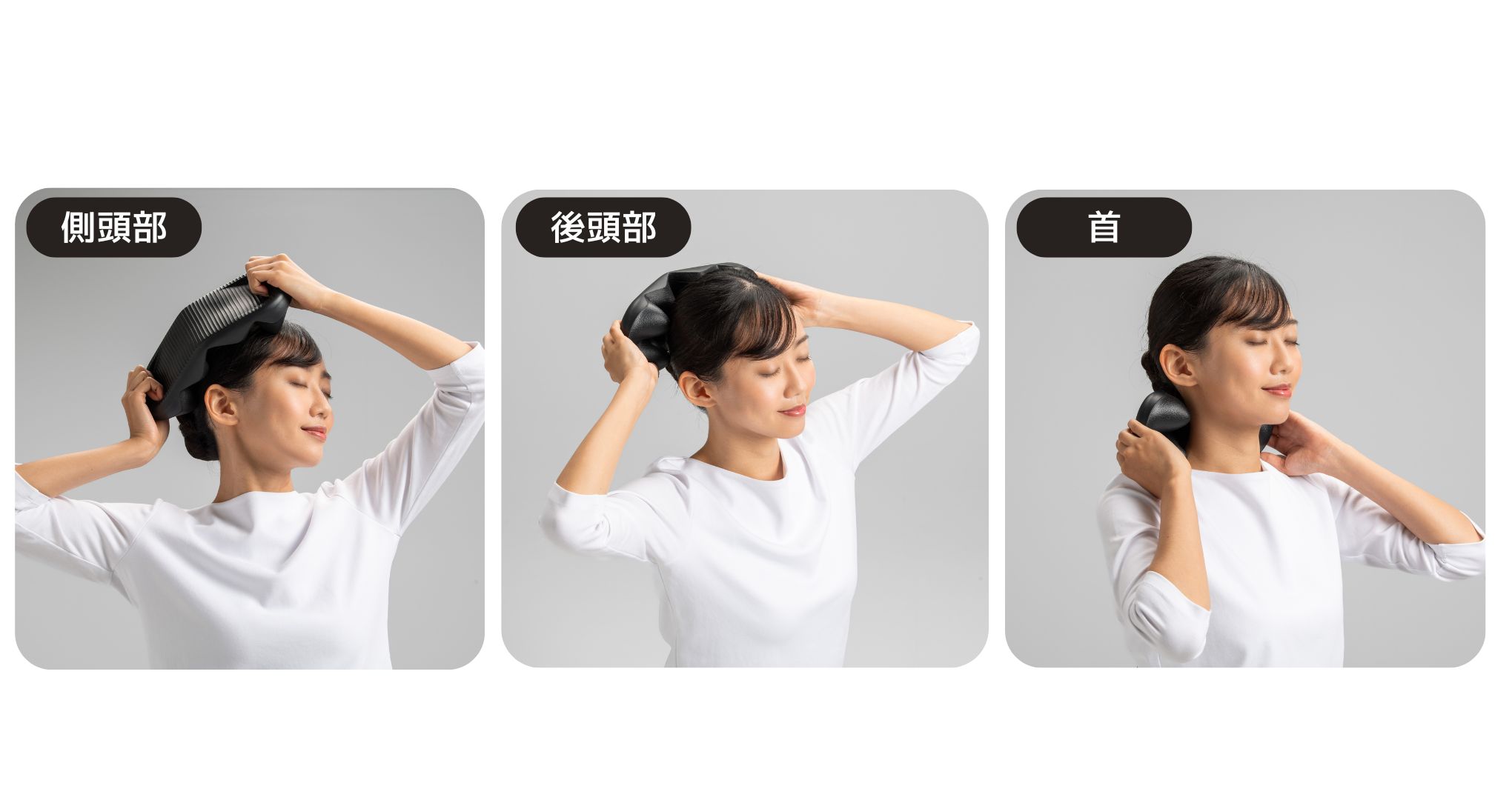 持ち方を変えれば、側頭部や後頭部、首の付け根もらくらくツボ押し。体の部位に合わせてぴったり沿うので、さまざまな部位の筋肉のこりをほぐすことができます。
