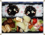 まっくろくろすけご飯 ぎんままさんが旦那様に作られた弁当の中で かわいくて簡単そうなキャラだった これを 真似てみました 佃煮昆布を丸く置いて、チーズ&海苔で作った目ゆかりふりかけの花チップで頬を 表現! ミートボール 市販品 玉子焼き 本日の味付けは 醤油&砂糖! マカロニマヨサラダ … 2014/01/30