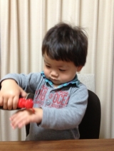 オモチャのピアノを弾きながら、何やら熱唱している、リナ「良いモノあるよちょっとコッチに来てごらーん」と、呼び寄せて…見せたのはコレっ くまモンボトル(空容器)&潤いシャンプー 300ml のセット ボトルもシャンプーも日本製で、値段は 1,800円(税抜)↑ こんな感じで、クリアケースに入ってる… 2014/05/09
