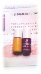 株式会社アローゼ さんの、自分で作る『私に合った美容液ファンデ』ミニサイズセット (クリスタルファンデミニサイズ(3g)&プレミアムエッセンスミニサイズ(3ml))モニター当選しました エルソワクリスタルファンデは保湿成分にこだわり配合、 さらに毛穴収縮成分として、ハマメリエキス、マッシュルーム… 2010/05/22
